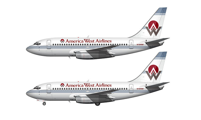 Side profile illustration of an America West Airlines 737-277/Adv (Advanced) with and without the landing gear deployed over a blank background