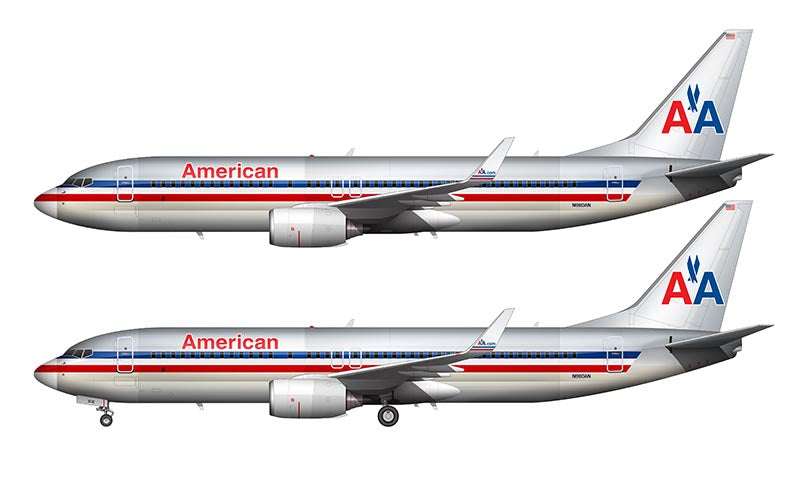 Side profile illustration of an American Airlines Boeing 737-823 in the bare metal livery with and without the landing gear deployed over a blank background
