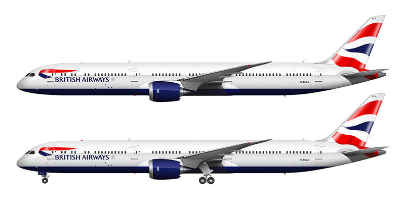 Side profile illustration of a British Airways 787-10 over a blank background with and without the landing gear deployed