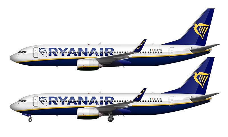 Side profile illustration of a Ryanair Boeing 737-8AS with and without the landing gear deployed over a blank background