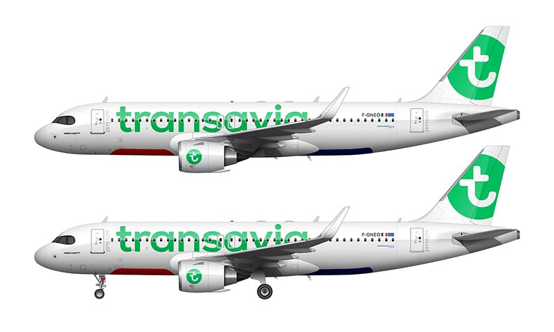 Side profile illustration of a Transavia A320-252N (A320neo) over a blank background with and without the landing gear deployed