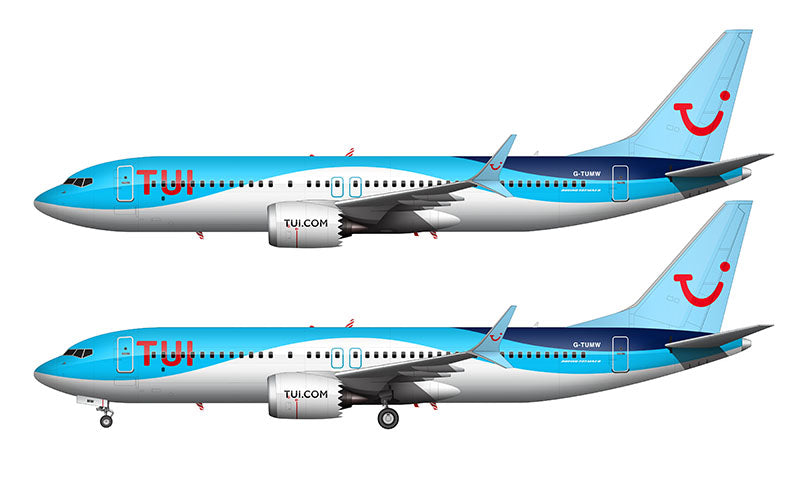 Side profile illustration of a TUI Airways Boeing 737 MAX 8 over a blank background with and without the landing gear deployed