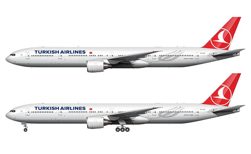 Side profile illustration of a Turkish Airlines Boeing 777-3F2/ER with and without the landing gear deployed over a blank background