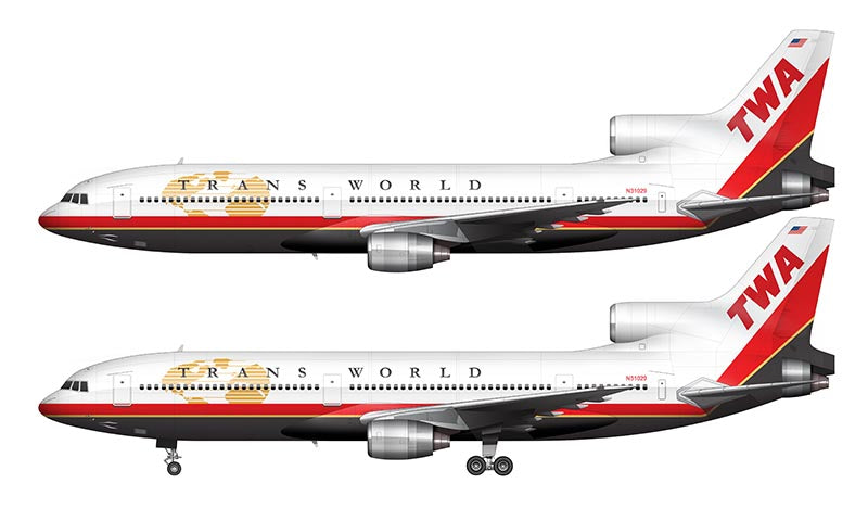 Side profile illustration of a Trans World Airlines (TWA) Lockheed L-1011-1 in the newest livery over a blank background with and without the landing gear deployed