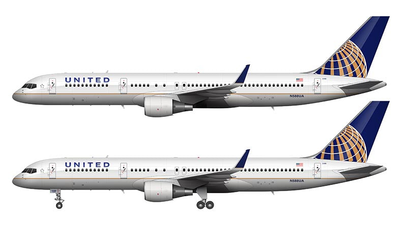 Side profile illustration of a United Airlines Boeing 757-200 with winglets in the Continental Globe livery over a blank background with and without the landing gear deployed