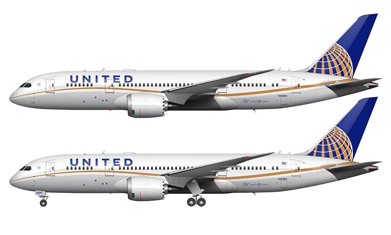 Side profile illustration of a United Airlines Boeing 787-8 in the Continental Globe livery over a blank background with and without the landing gear deployed