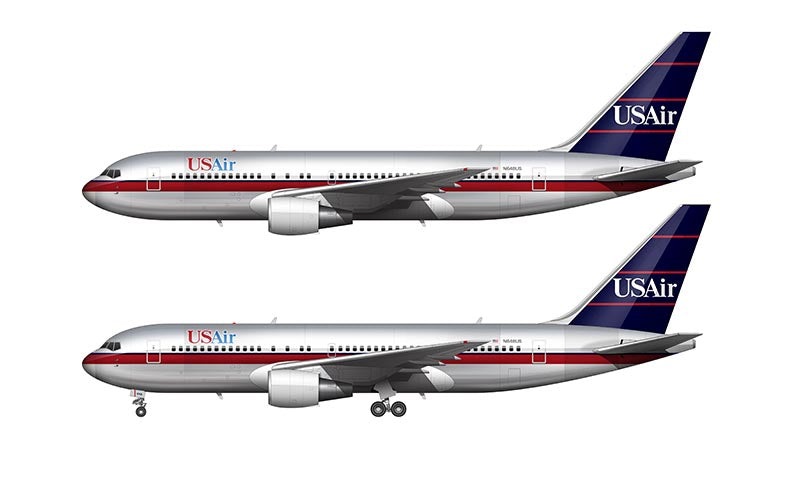 Side profile illustration of a USAir Boeing 767-201/ER over a blank background with and without the landing gear deployed
