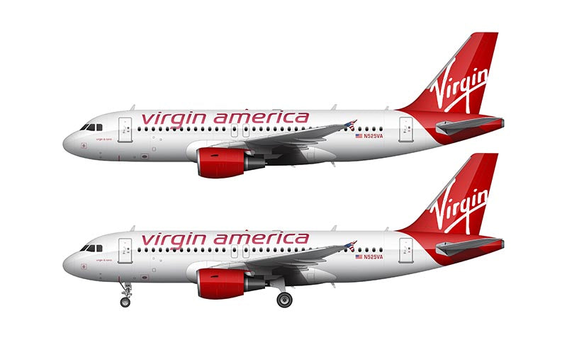 Side profile illustration of a Virgin America Airbus A319 over a blank background with and without the landing gear deployed