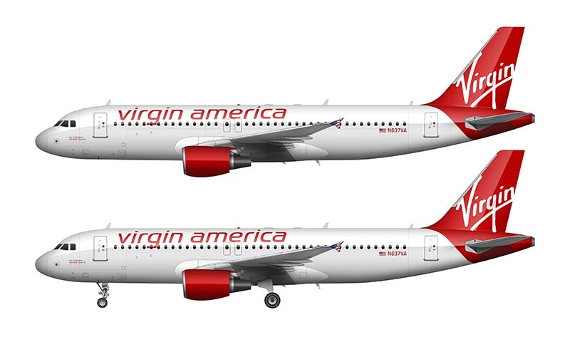 Side profile illustration of a Virgin America Airbus A320 over a blank background with and without the landing gear deployed